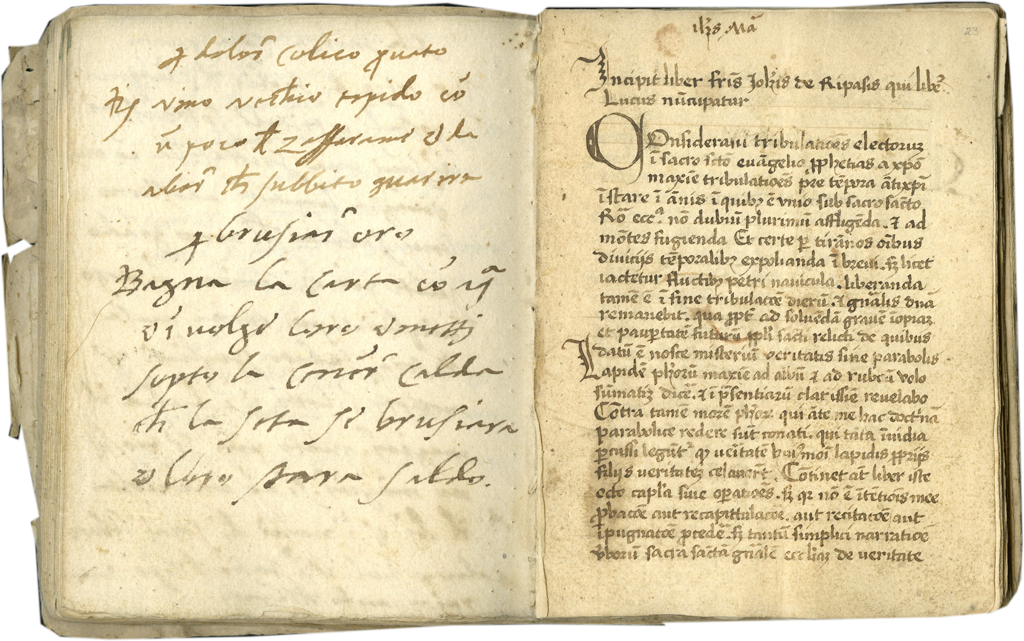 The opening page of the Liber lucis, nestled among later recipes, TM 843, ff. 22v-23