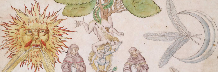In the sixteenth century, when this book was produced, alchemical texts and their writers embraced secrecy and concealment. Authors often wrote under pseudonyms, and alchemical texts encoded their secrets in allegory, emblematic imagery (as in the scroll above), and Christian symbolism. Perhaps our manuscript physically embodies this desire for secrecy, concealing its alchemical contents from casual discovery – or from censure.